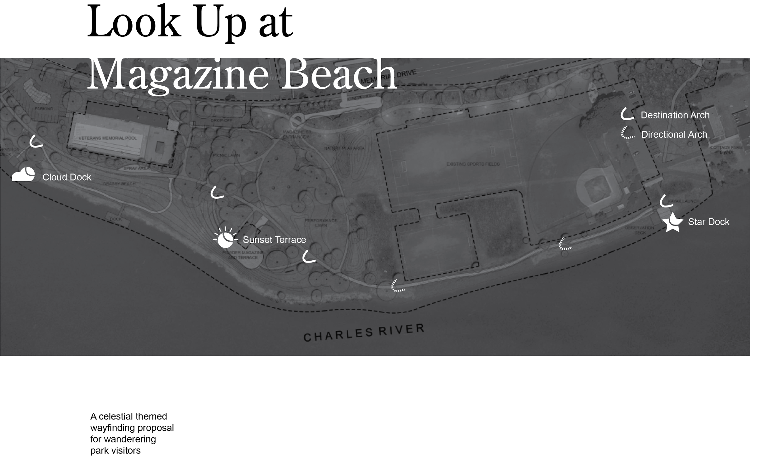 Look Up is a celestial wayfinding proposal for park visitors wandering around Magazine Beach.