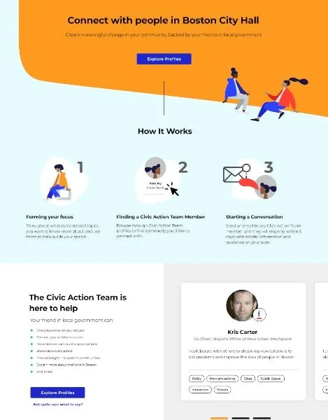 The Mayor’s Office of New Urban Mechanics and the Scout Labs team saw the mandated civic action projects as a wonderful opportunity to increase student engagement with the government. We wondered how we could help Boston Public School students work with the local government on their action civics projects and have a meaningful experience. Throughout the Fall 2019 - Spring 2020 school year, our teams conducted research and built a website and service system to help these students better engage with people in City Hall and the work that they do.