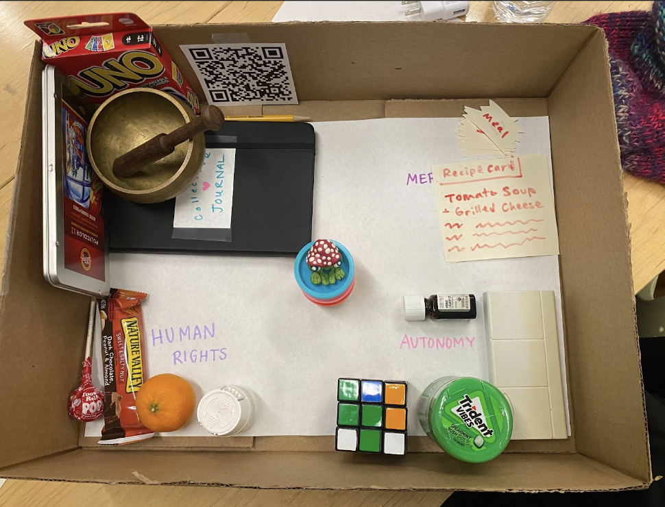 In our final concept prototype, we presented our work to the class. Browse the presentation slides. We incorporated things like play-doh for autonomy, a collaborative journal for interpersonal care, a take-one-leave-one meal share ticket system for merit, and granola bars for human rights. Watch a bit of our live demo. In addition to the box, my teammates and I presented a service map and story to imagine how this tradition could realistically live on across our entire college.